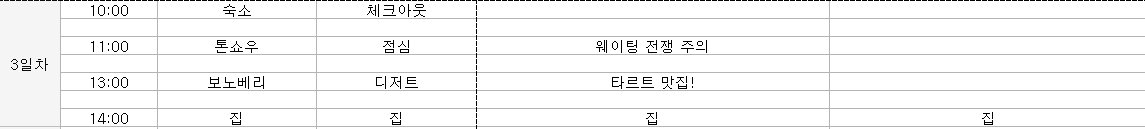| 관광 : 흰여울문화마을 | 관광 : 해운대 레일바이크 | 점심 : 톤쇼우 (웨이팅전쟁) |