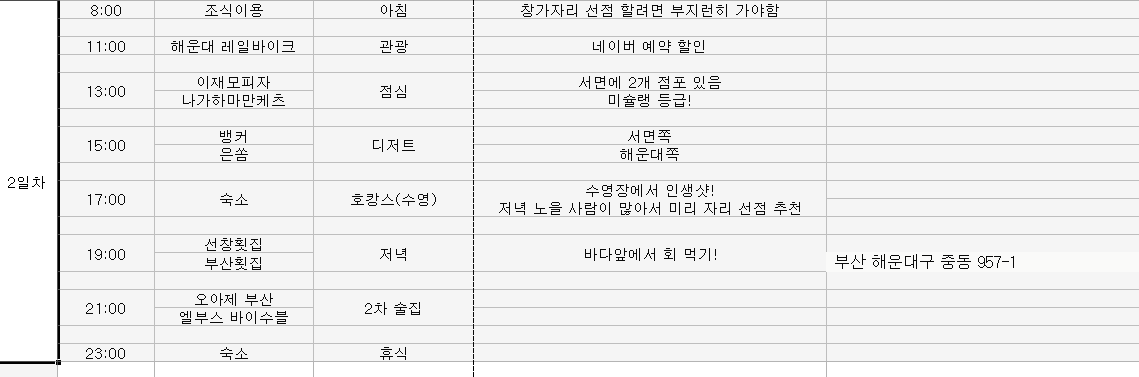 | 카페/디저트 : 호랑이젤라떡 / 포시즌베리 해운대 | 저녁 : 선창횟집 / 부산횟집 | |